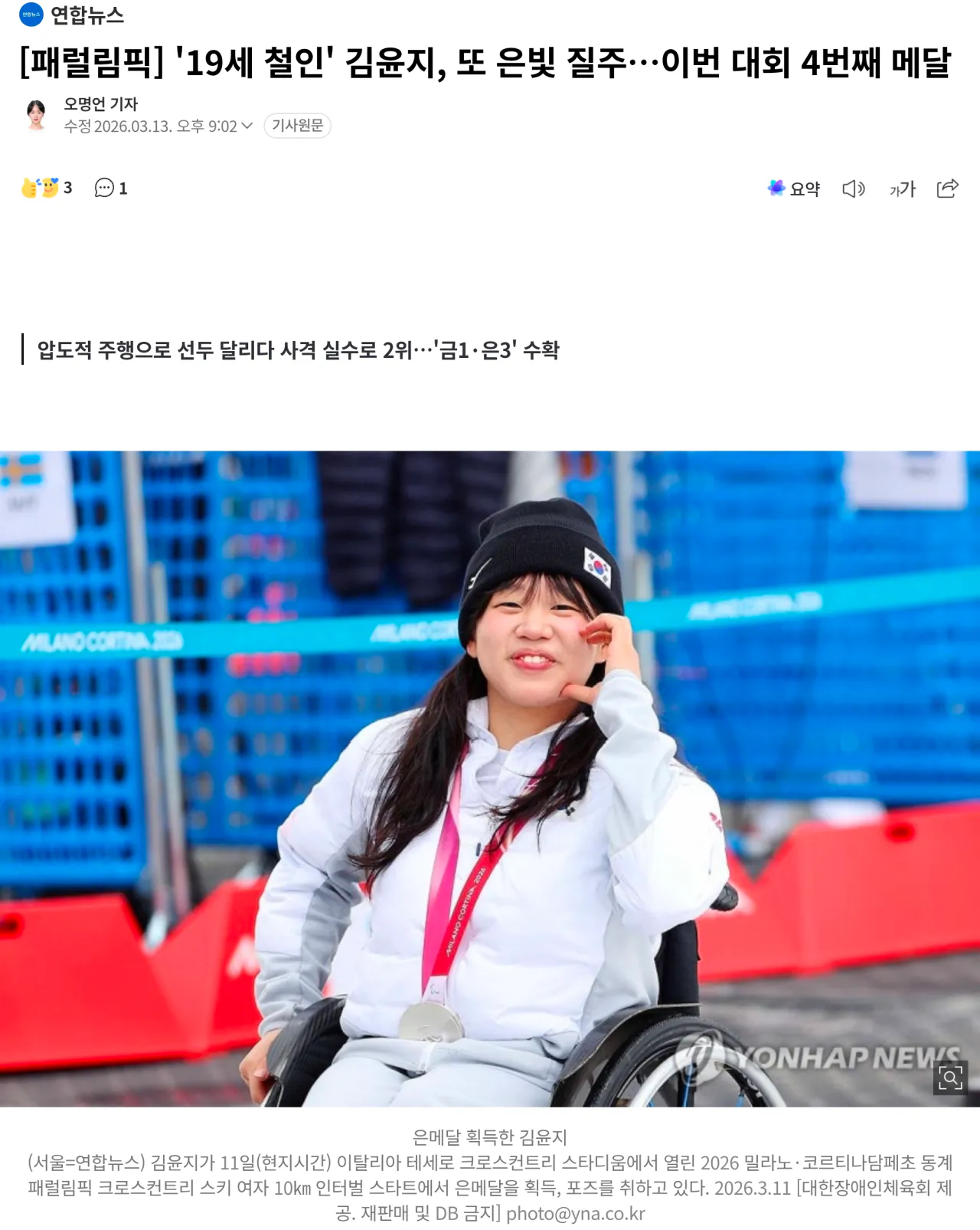 [패럴림픽] '19세 철인' 김윤지, 또 은빛 질주 이번 대회 4번째 메달