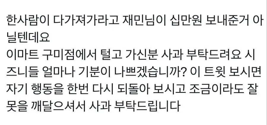 이마트 내부 직원이 아이돌그룹 엔시티(NCT)의 멤버 재민이 팬들에게 보낸 상품권을 가로채 논란이 일고 있는 가운데 신세계그룹이 고개를 숙였다. 신세계그룹은 상품권 발권 및 교환 관련 관리 기준 강화를 통해 재발 방지에 나서겠다는 입장이다.