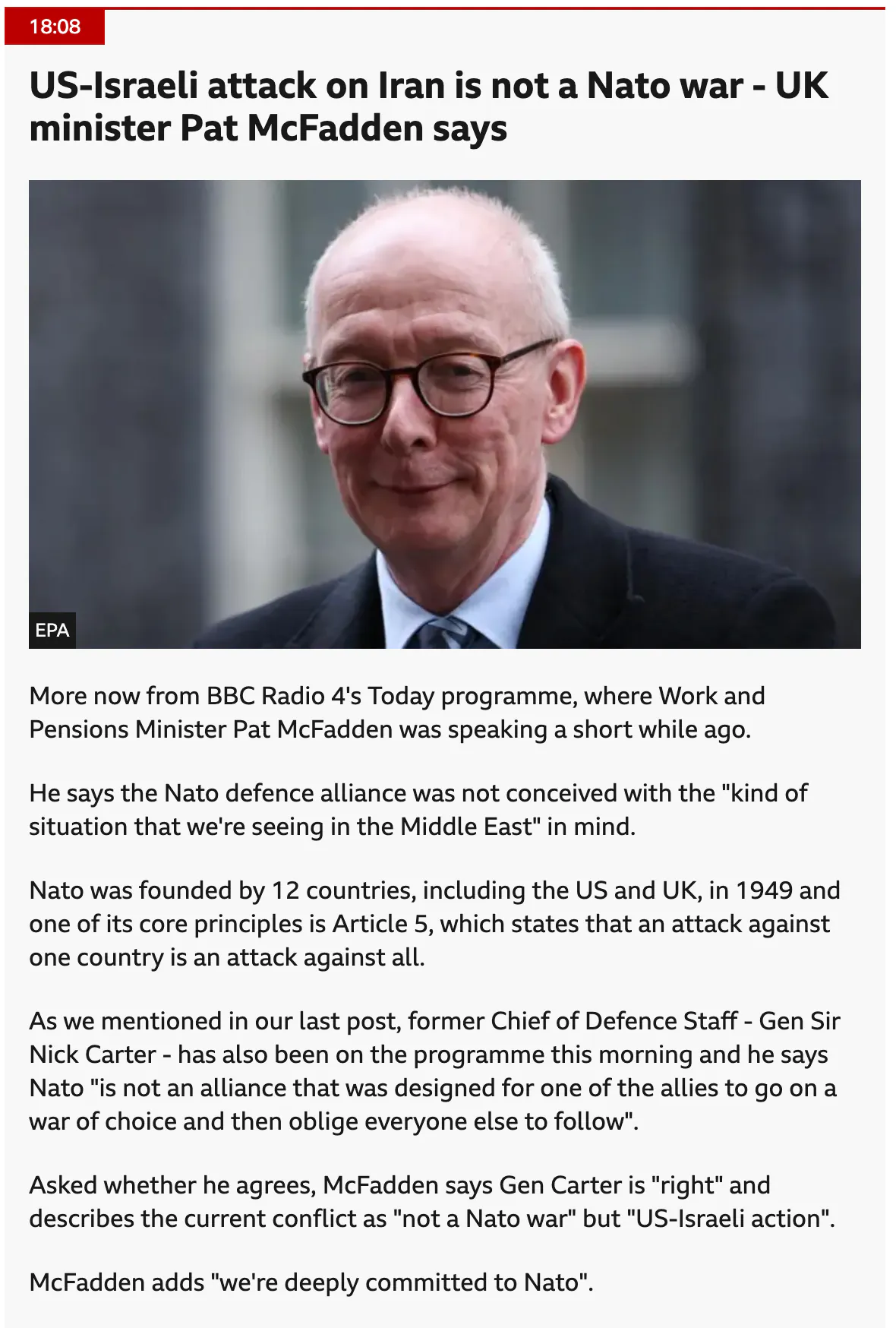 [BBC] 팻 맥패든(Pat McFadden) 영국 노동연금부 장관은 현재 중동에서 벌어지고 있는 분쟁이 나토(NATO) 차원의 전쟁이 아닌 '미국과 이스라엘의 독자적인 군사 행동'이라고 규정했습니다.