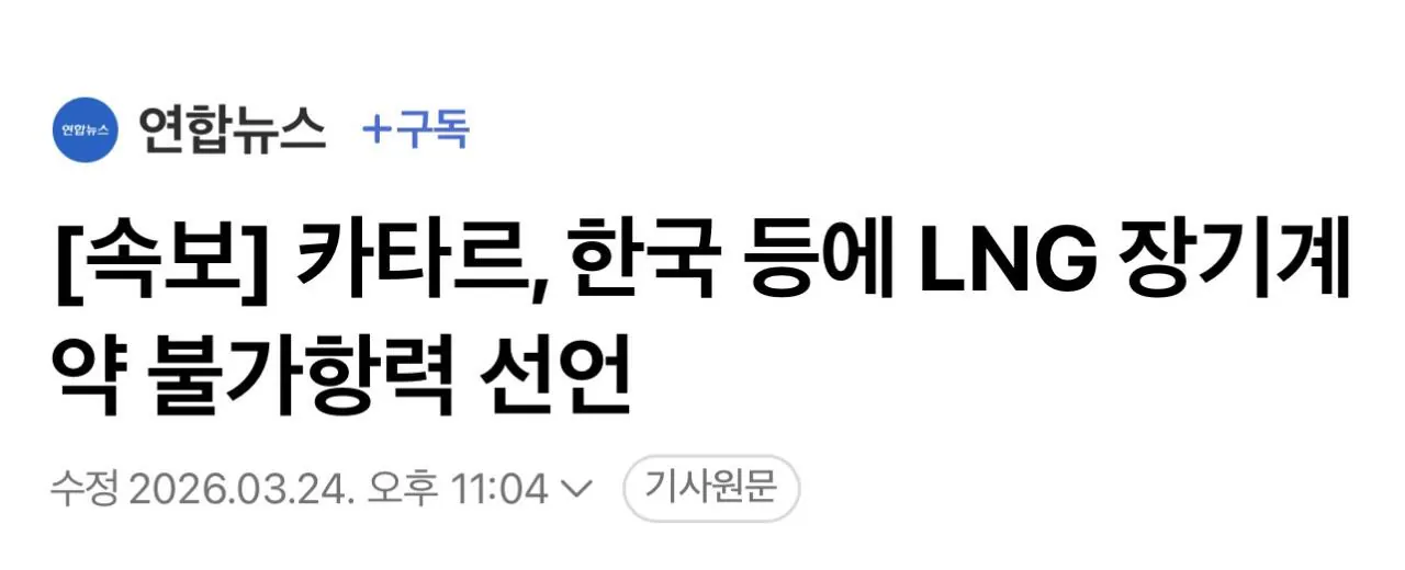 카타르 국영 에너지 기업인 카타르에너지가 한국을 포함한 주요 수입국에 대한 액화천연가스(LNG) 장기 공급 계약에 대해 '불가항력'(Force Majeure)을 선언했다.