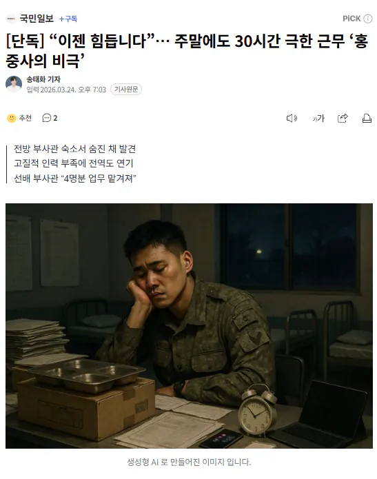 경기도 파주 육군 전방사단 급양관리관이었던 홍성찬 중사가 지난 15일 부대 인근 영외 숙소에서 투신해 사망했다. 향년 28세. 2019년 임관 후 2024년 해당 부대로 발령받은 뒤 구조적 인력 부족 속에서 과중한 업무를 홀로 감당하다 극단적 선택에 이른 것으로 파악됐다. 홍 중사의 죽음은 절반도 안 됐던 부사관 충원율, 막내급 인력에 업무를 몰아준 부조리함, 예민해진 사병 관리 부담 등이 반복적으로 집중되며 발생한 인재인 정황이 드러났다.