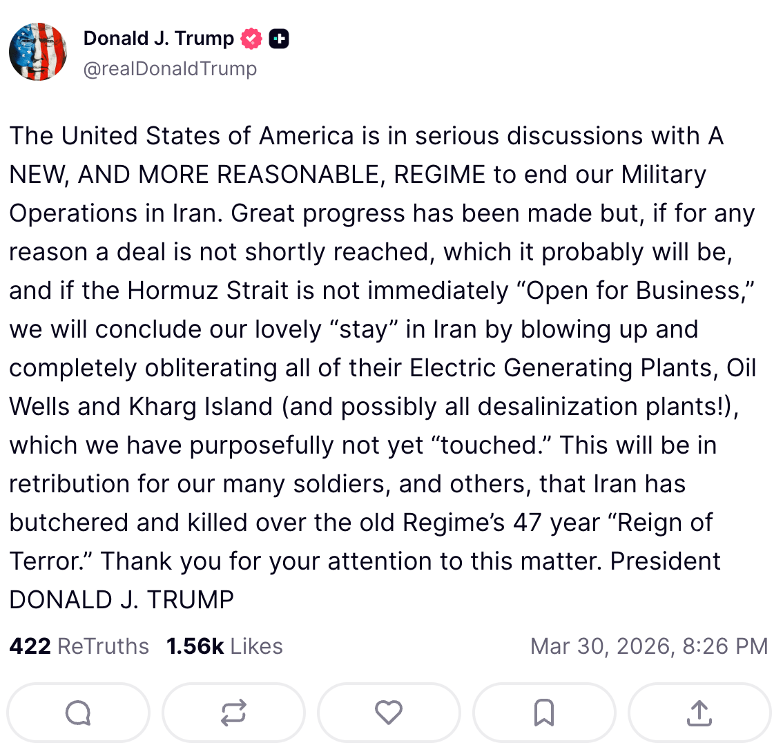 미합중국은 이란에서의 군사 작전을 종식하기 위해, 더욱 이성적인 새로운 정권과 진지한 논의를 진행 중입니다.