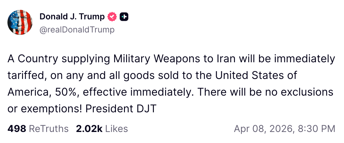 [속보]트럼프, "이란에 무기팔면 관세 50%"