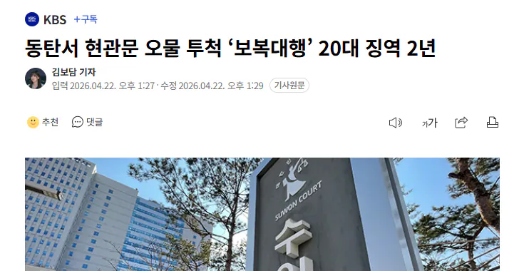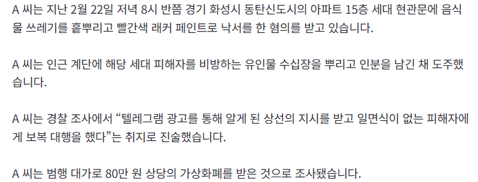 동탄서 현관문 오물 투척 ‘보복대행’ 20대 징역 2년 ㄷㄷㄷㄷ