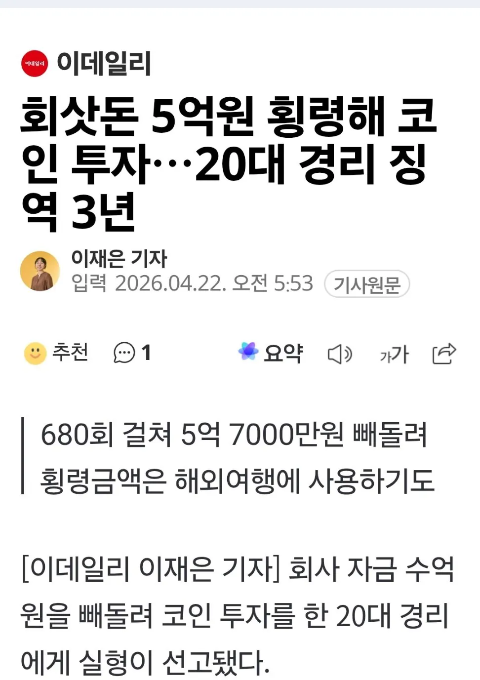 20대 여자경리 680회 걸쳐 법인자금 5.7억 횡령. 징역3년 선고