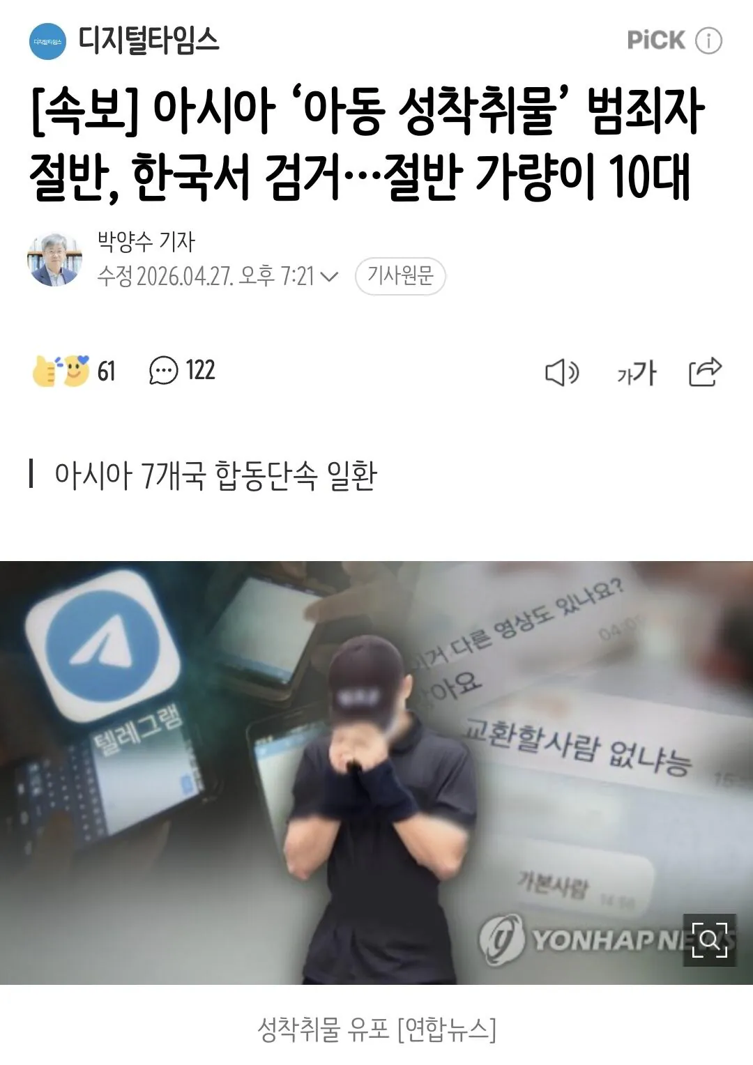 [속보] 아시아 ‘아동 성착취물’ 범죄자 절반, 한국서 검거…절반 가량이 10대