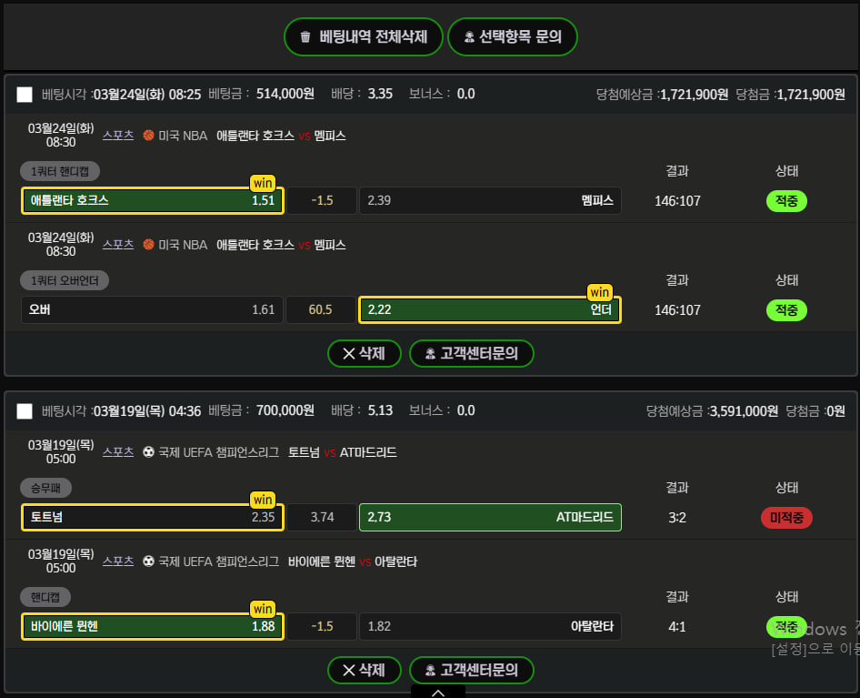 스포츠 두폴더만 묶어서 배팅하는대 두개 중에 한개는 적중 !