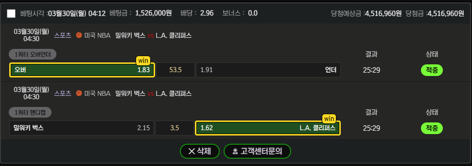 따끈따끈 오늘 느바 승부보려고 1쿼터 배팅했습다 배당도 나쁘지 않아서 이번에도 150충 2폴더배팅