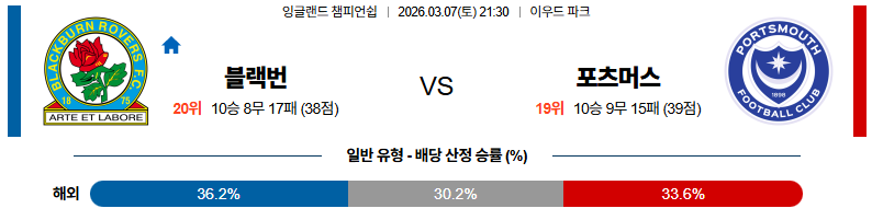 블랙번 대 포츠머스 잉글랜드챔피언쉽 03월07일 맞대결 생중계, 스포츠중계, 스포츠분석