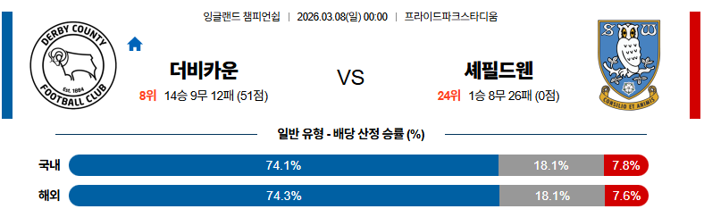 더비카운티 대 셰필드웬즈데이 잉글랜드챔피언쉽 03월08일 맞대결 생중계, 스포츠중계, 스포츠분석