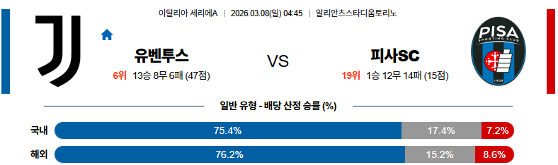유벤투스는 최근 볼 점유율 강화와 패스 네트워크 정비를 통해 점유와 효율을 동시에 끌어올리는 방향으로 팀 색깔을 확실히 잡아가고 있습니다. 반면 피사는 타깃형 스트라이커 중심의 단선적인 전개와 중원 부담 집중이라는 구조적 한계를 안고 있어, 강한 압박과 수적 우위를 기반으로 하는 팀을 상대로는 장기전에서 버티기 쉽지 않은 구도입니다. 전술 완성도, 스쿼드 밸런스, 경기 운영 능력을 종합적으로 고려할 때, 이번 경기는 유벤투스가 자신들이 원하는 방식으로 경기를 통제하며 승리로 연결할 가능성이 더 높다고 판단됩니다.