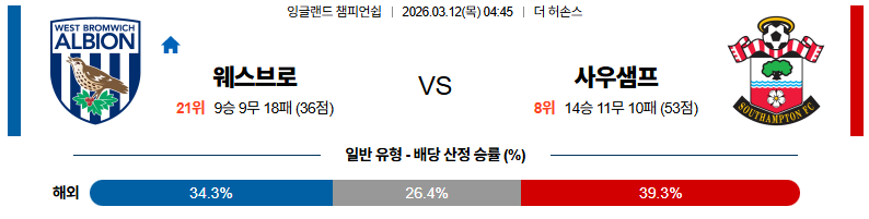웨스트브로미치 대 사우샘프턴 잉글랜드챔피언쉽 03월12일 맞대결 생중계, 스포츠중계, 스포츠분석