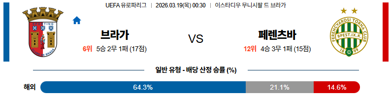 브라가 대 페렌츠바로스 UEFA유로파리그 03월19일 맞대결 생중계, 스포츠중계, 스포츠분석