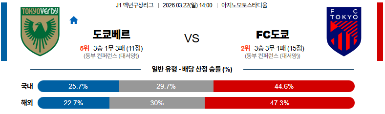 도쿄베르디 대 FC도쿄 J리그1 03월22일 맞대결 생중계, 스포츠중계, 스포츠분석
