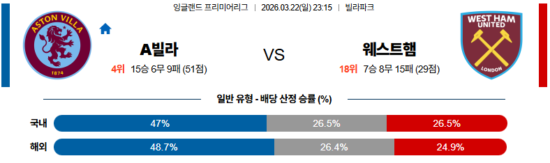아스톤빌라 대 웨스트햄 프리미어리그 03월22일 맞대결 생중계, 스포츠중계, 스포츠분석