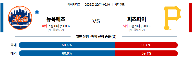 뉴욕메츠 대 피츠버그 MLB 03월29일 맞대결 생중계, 스포츠중계, 스포츠분석